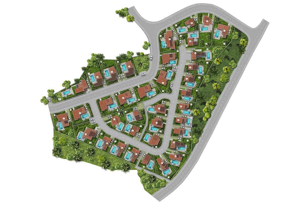 Pissouri Forest Park is an exclusive residential development located at the highest elevation of Pissouri village on the southern coast of Cyprus. From this elevated position the project enjoys uninterrupted panoramic views over Pissouri Bay and the Mediterranean Sea. The hillside setting provides open views of the surrounding countryside while maintaining a peaceful and private residential atmosphere.